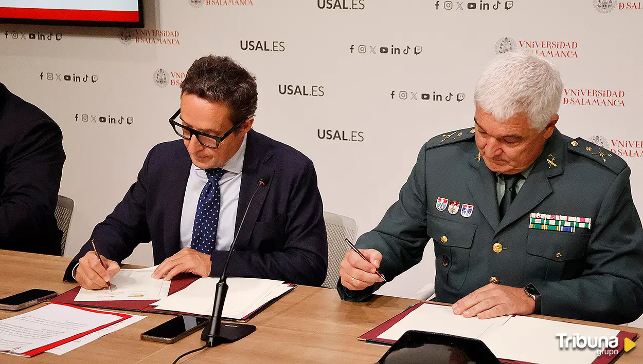 La Universidad de Salamanca y la Guardia Civil han unido sus fuerzas para fomentar la 'cultura de la seguridad'. Para ello, el rector de la USAL, Juan Manuel Corchado, y el general jefe de la zona de la Guardia Civil de Castilla y León, Miguel Sánchez Guerrero, han firmado el protocolo general de actuación en materia de formación e investigación por el que ambas instituciones colaborarán en diversos ámbitos y por el que la institución académica pone su capacidad y sus recursos al servicio del Instituto Armado. Un protocolo que redundará en beneficios para la sociedad en general, especialmente en el ámbito de la mejora de la prevención delictiva y la investigación científica.