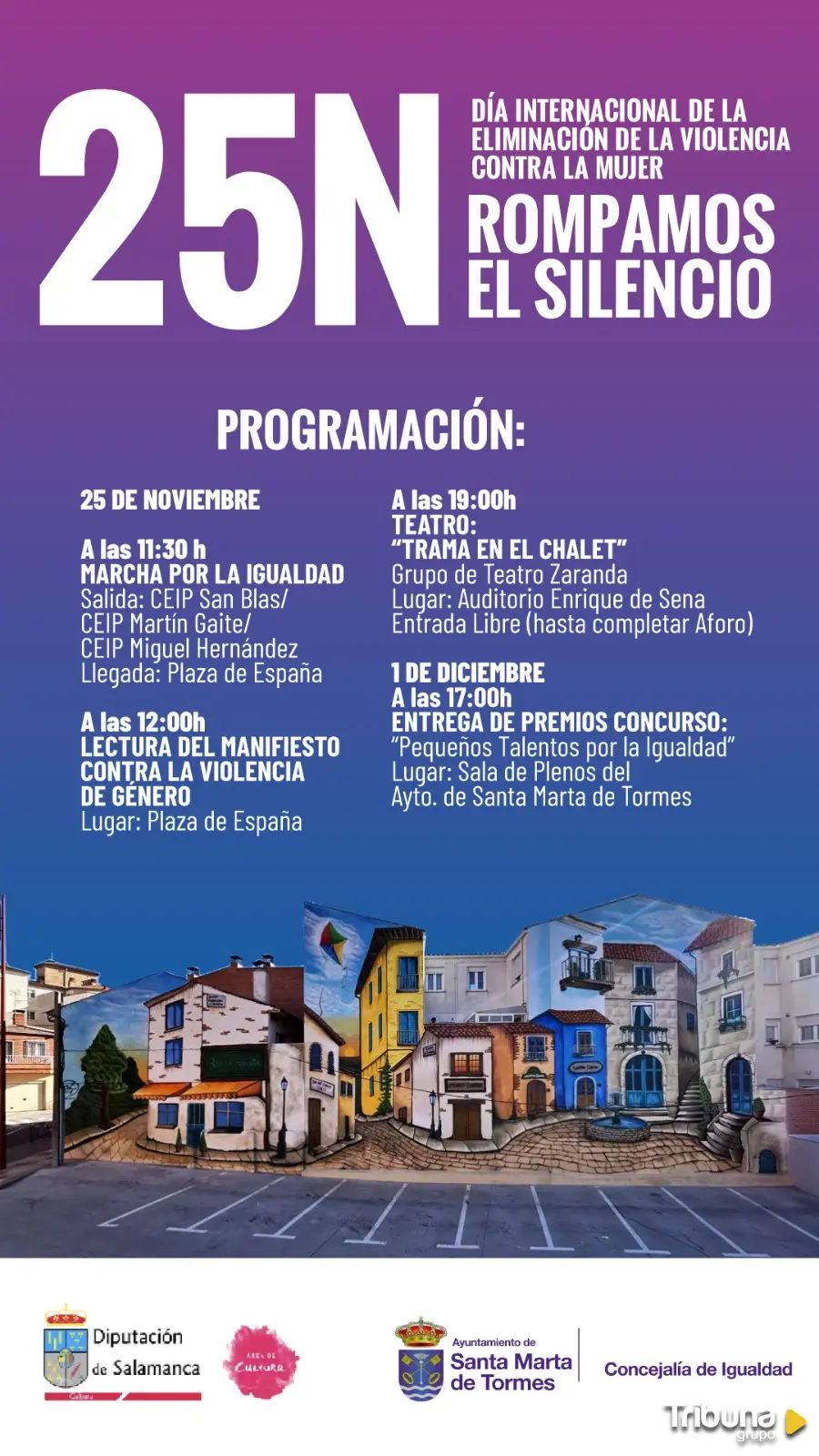 El Ayuntamiento de Santa Marta de Tormes ha preparado un año más una programación especial con motivo del Día Internacional de la Eliminación de la Violencia contra la Mujer, centrada especialmente en la participación de los más pequeños del municipio. Los actos, que se celebrarán este 25 de noviembre, volverán a implicar a los escolares de Infantil y Primaria, quienes tendrán un papel protagonista en la jornada.