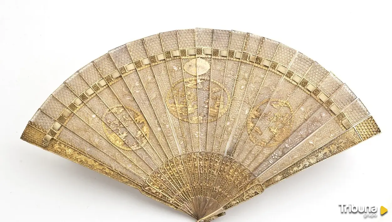 Y no es el único objeto vinculado con la reina Victoria Eugenia y con Salamanca. Entre los fondos, un abanico compuesto por veinticuatro varillas de filigrana, unidas entre sí mediante una cinta de seda amarilla; los padrones se ornamentan a juego. Los laterales muestran una escena fluvial, con construcciones, nubes y barcos, mientras que el central presenta un paisaje ajardinado. Sobre este último se ha añadido una placa en la que figura la dedicatoria a la reina Victoria Eugenia, tal y como recoge la ficha identificativa de este abanico que se custodia en el Museo del Traje.