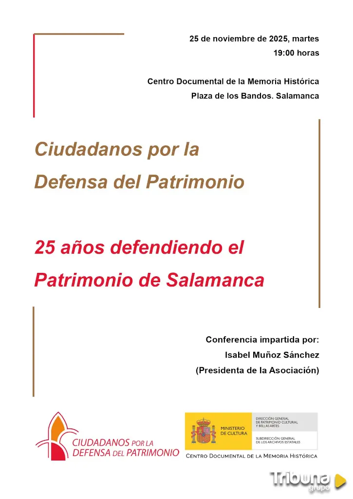 Tras un cuarto de siglo reivindicando y tratando de poner en valor el patrimonio salmantino, la asociación Ciudadanos por la Defensa del Patrimonio de Salamanca celebrará dicho aniversario con una conferencia en el Centro Documental de la Memoria Histórica.