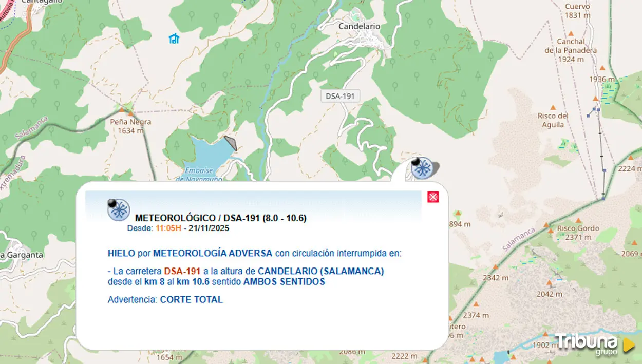 La presencia de hielo, nieve y condiciones meteorológicas adversas han obligado a cortar la carretera de acceso al Travieso, en Candelario, según informa la Dirección General de Tráfico. En concreto, se encuentra en nivel negro, es decir, cerrada por completo al tráfico, la DSA-191 desde el kilómetro 8 al 10,6 y en ambos sentidos.
