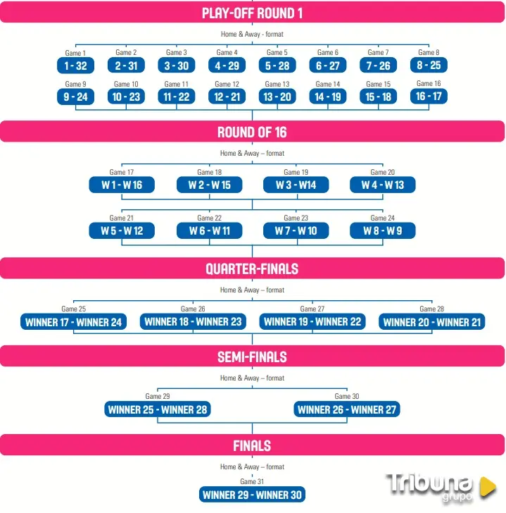 Con la clasificación cerrada, comienza la fase final. El sistema es directo: eliminatorias a doble partido, ida y vuelta, avanzando el equipo que consiga mejor resultado global. El cruce sigue el orden clásico de un cuadro competitivo: el primer clasificado se enfrenta al 32, el segundo al 31, el tercero al 30 y así sucesivamente.