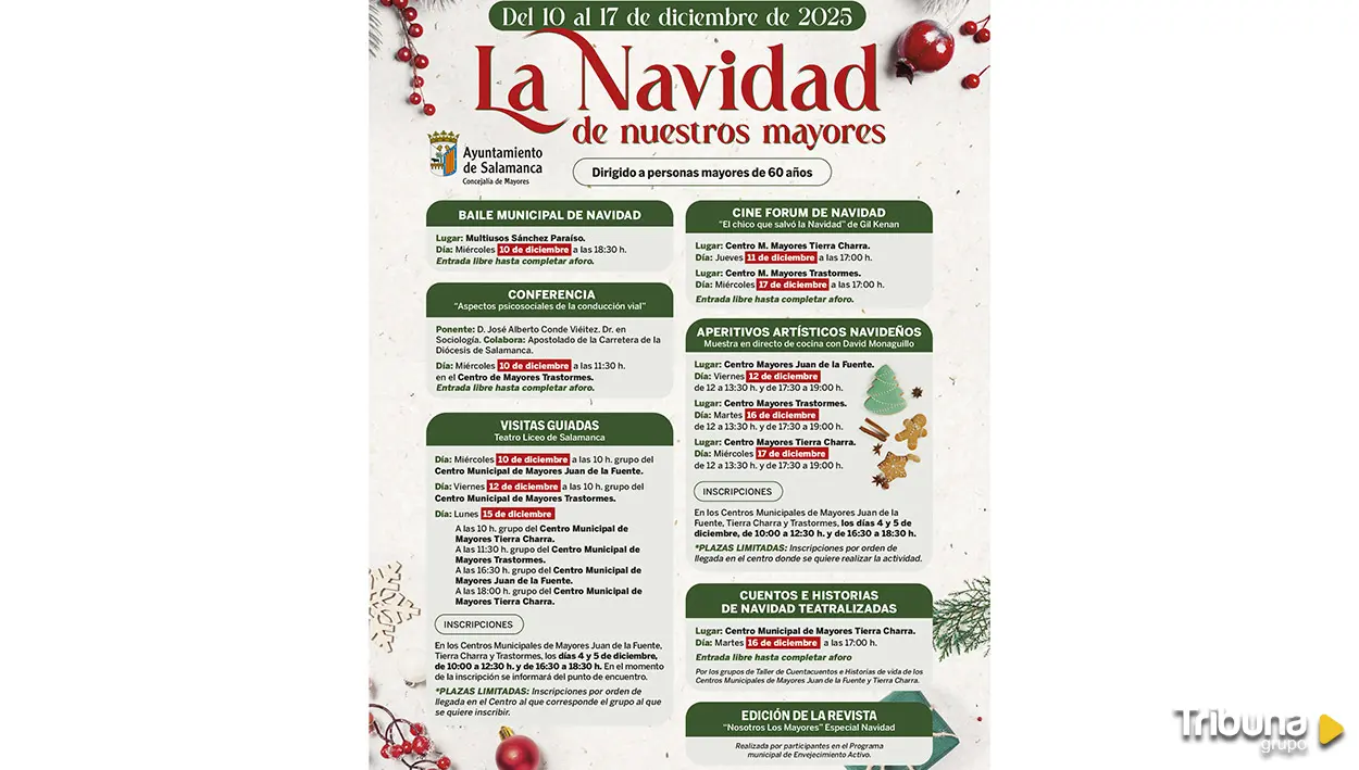 El Ayuntamiento de Salamanca abre los días 4 y 5 de diciembre el plazo de inscripción de las actividades municipales de Navidad con plazas limitadas destinadas a personas mayores de 60 años. En concreto, se requiere inscripción previa para participar en las visitas guiadas al Teatro Liceo los días 10, 12 y 15 de diciembre, y los talleres de cocina en directo que impartirá David Monaguillo los días 12, 16 y 17 de diciembre en los centros municipales de mayores Juan de la Fuente, Trastormes y Tierra Charra, respectivamente.