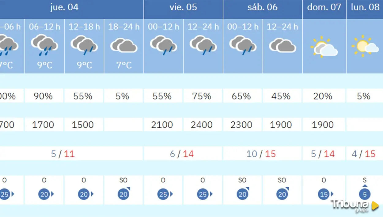 En el caso de Salamanca, aunque los cielos estarán cubiertos y el sábado, día 6, conviene sacar el paraguas ante la probabilidad de chubascos (entre el 45 y el 65% de probabilidad a lo largo del día), lo cierto es que las temperaturas serán mucho más suaves, con máximas que alcanzarán los 15 grados el sábado -jornada en la que las mínimas subirán hasta los 10 grados- y 14 grados de máximas el domingo, día 7.