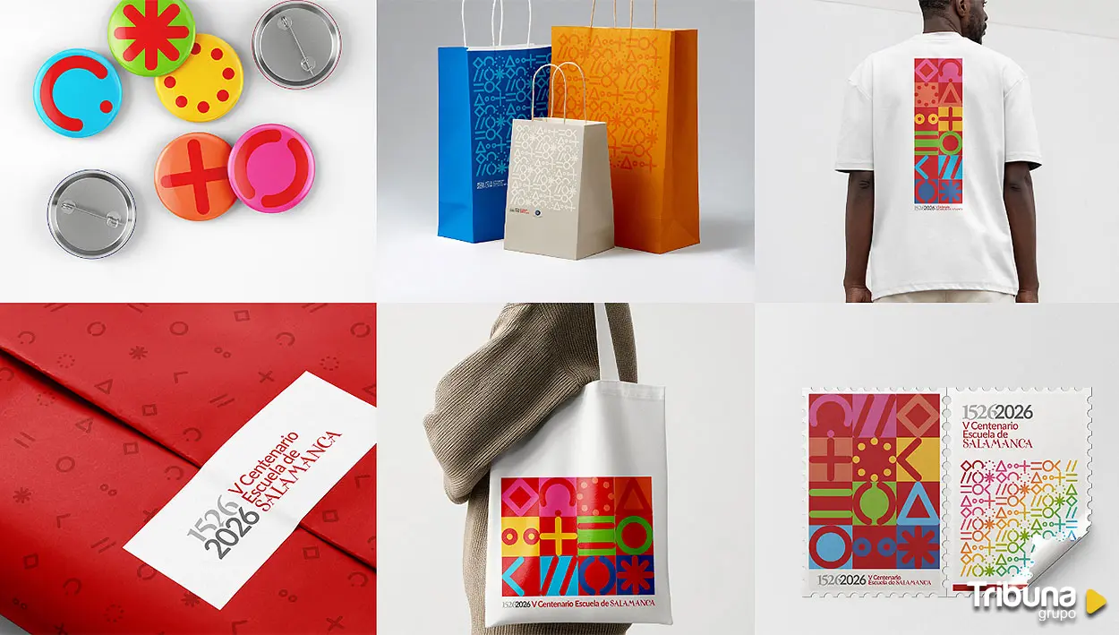 La marca "está formada por tres bloque temáticos". Uno es la parte numérica: "Un 1526 medio oculto, con una tipografía romana antigua como la Garamond", que "da paso a un 2026, en una tipografía sin serifa, creada en 2010, la familia Lato". Otro, evidente, es el propio nombre de la celebración 'V Centenario Escuela de Salamanca'. "El texto correspondiente a la conmemoración actual aparece en Lato, contrastando con las formas antiguas de la tipografía Vítor de la palabra 'Salamanca'". Esa divergencia "enfatiza el transcurso del tiempo y contextualiza cada elemento en la etapa que le corresponde".