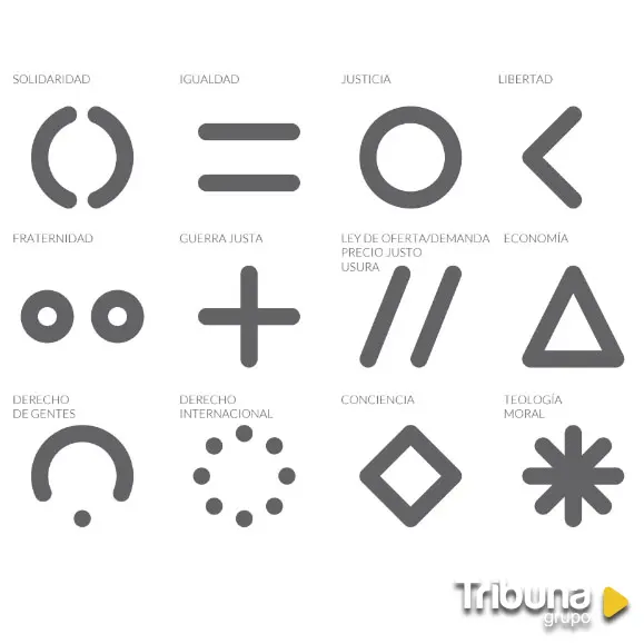 La parte más llamativa e intrigante son una docena de símbolos sin, a priori, un significado evidente. ¿Qué son en realidad? Según el Manual, cada uno representa un hallazgo o concepto abordado por la Escuela de Salamanca: "conciencia; derecho de gentes; derecho internacional; economía; fraternidad; guerra justa/de auxiliis; igualdad; justicia; libertad; ley de oferta-demanda / precio justo / usura; solidaridad; teología". Esas ideas fueron "cuna de los derechos de nuestra sociedad actual" y por eso se merecen "su papel en la identidad" corporativa, plasmada en una sencilla figura geométrica.