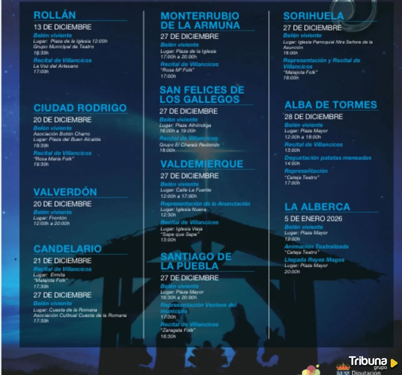 El circuito arrancará este sábado, 13 de diciembre, en Rollán y finalizará en La Alberca el próximo 5 de enero, donde se simulará la llegada de los Reyes Magos. Durante la jornada, se recreará el nacimiento de Jesús en Belén y cada municipio lo hará rememorando también sus oficios tradicionales, sus trajes típicos y su arquitectura, ya que cinco de ellos son conjuntos históricos. Además, las jornadas incluyen también un recital de villancicos o una representación teatralizada ofrecida por la institución provincial.