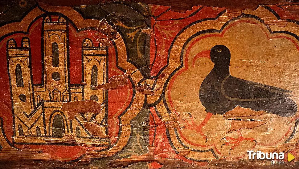 Detalle de la decoración del techo del convento, con un castillo y una chova piquirroja.