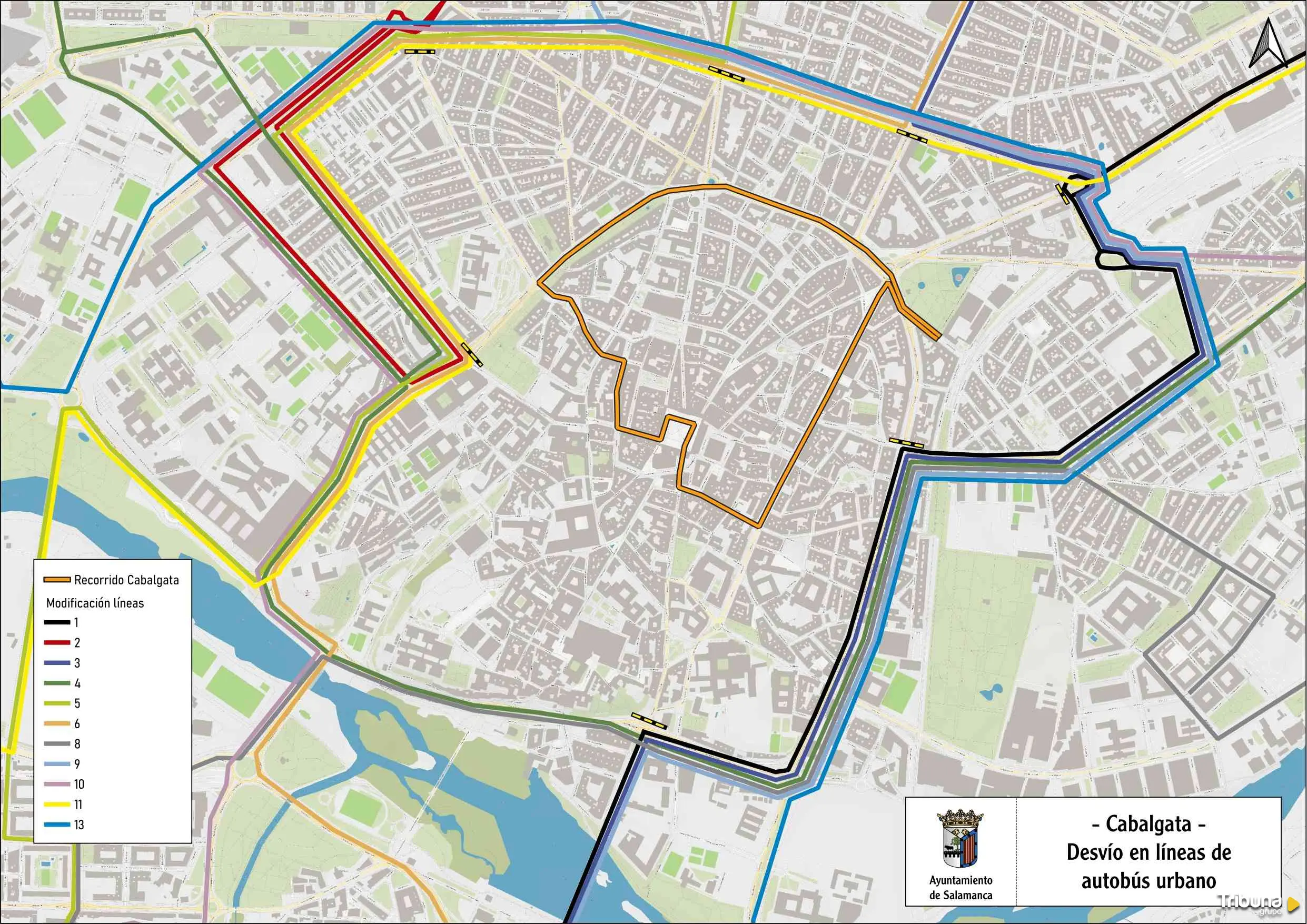 Se establecen recorridos alternativos del transporte urbano en autobús durante el transcurso de la comitiva por las siguientes calles: Plaza de España, Avenida de Mirat, Puerta Zamora, Paseo de Carmelitas, Plaza de la Fuente, Peña Primera, Íscar Peyra, Juan del Rey, Plaza del Corrillo, Plaza Mayor, Plaza Poeta Iglesias, calle San Pablo, Plaza San Justo, Gran Vía, Plaza de España y finalizará de nuevo en el Parque de la Alamedilla. Cabe recordar que los autobuses urbanos serán gratuitos desde las cuatro de la tarde hasta la medianoche.