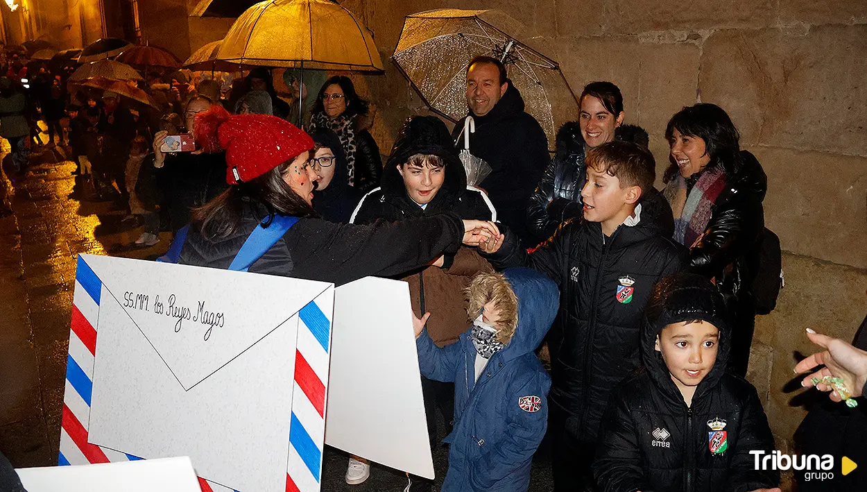 A media tarde, cuando el frío comenzaba a adueñarse de las calles del centro histórico y también aparecía la lluvia y con ellas los paraguas, Salamanca se ha transformado en un escenario de fantasía con la llegada del Cartero Real, encargado de recoger los últimos deseos de los niños antes de la noche más esperada del año.