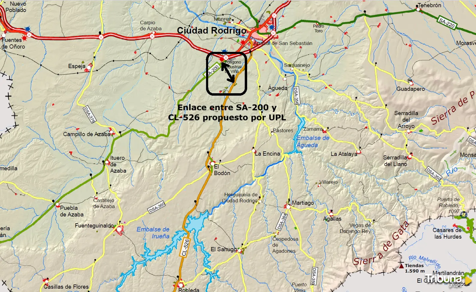 Por ello, desde Unión del Pueblo Leonés insisten, mediante una pregunta registrada en las Cortes autonómicas, en reclamar a la Junta que conecte la SA-200 y la CL-526 para dotar de acceso a la A-62 a la carretera Ciudad Rodrigo-Coria y facilitar el acceso a esta autovía y al polígono de Las Viñas desde o hacia las comarcas del Campo de Robledo y El Rebollar, así como a Coria, Cáceres o Plasencia.