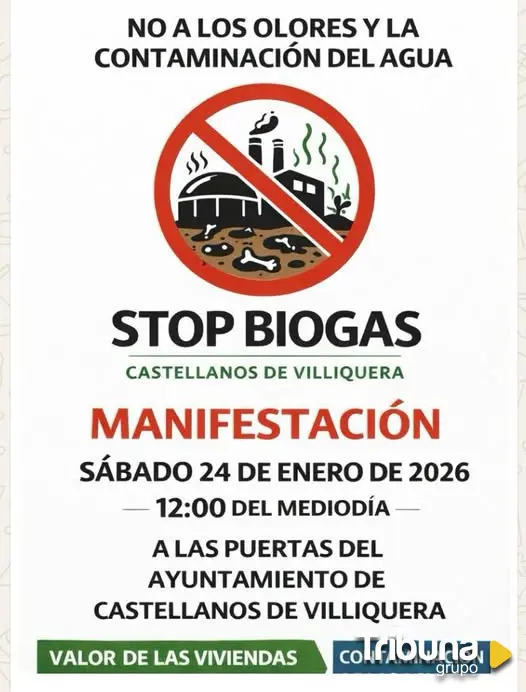 Vecinos de los alrededores de Castellanos de Villiquera se concentrarán el próximo sábado, 24 de enero, frente al Ayuntamiento de la localidad para protestar contra la planta de biogás que pretende instalarse en el municipio. La cita tendrá lugar a las 12:00 horas y en ella se pretende mostrar el rechazo al proyecto debido a los olores por el tratamiento de purines y a la contaminación del agua, según refleja el cartel anunciador.