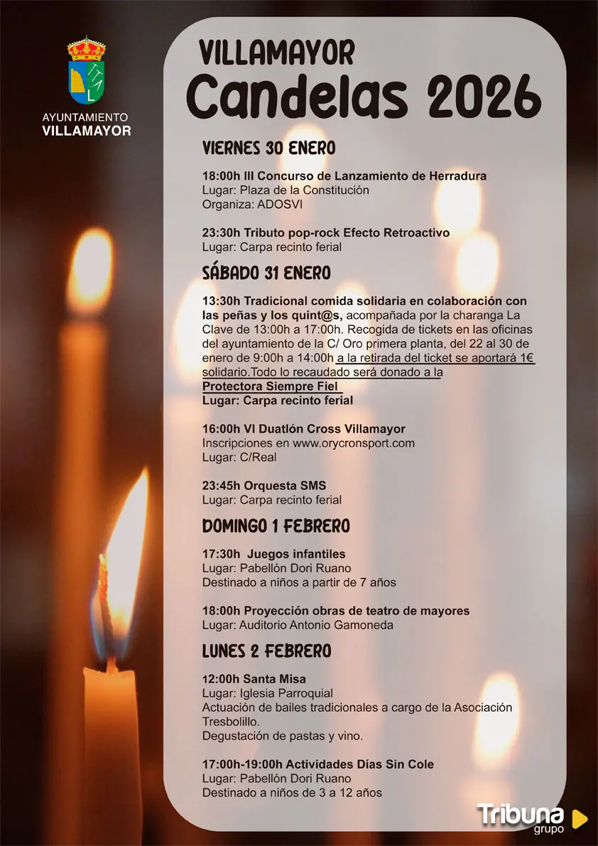 El Ayuntamiento de Villamayor tiene ya todo preparado para la celebración de la fiesta de Las Candelas 2026, la primera gran cita festiva del municipio del año, que se celebrará del viernes 30 de enero al lunes 2 de febrero. Para ello, se ha previsto una programación que combina tradición, deporte, música y actividades para todos los públicos.