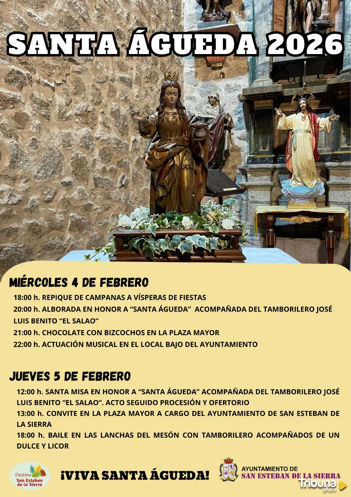 El 5 de febrero se celebra el día de Santa Águeda, que recibirá su homenaje en la misa, la procesión y el ofertorio que darán comienzo en torno al mediodía con el acompañamiento musical de 'El Salao' y que darán paso al tradicional convite que cada año ofrece el Ayuntamiento de San Esteban de la Sierra en la Plaza Mayor.