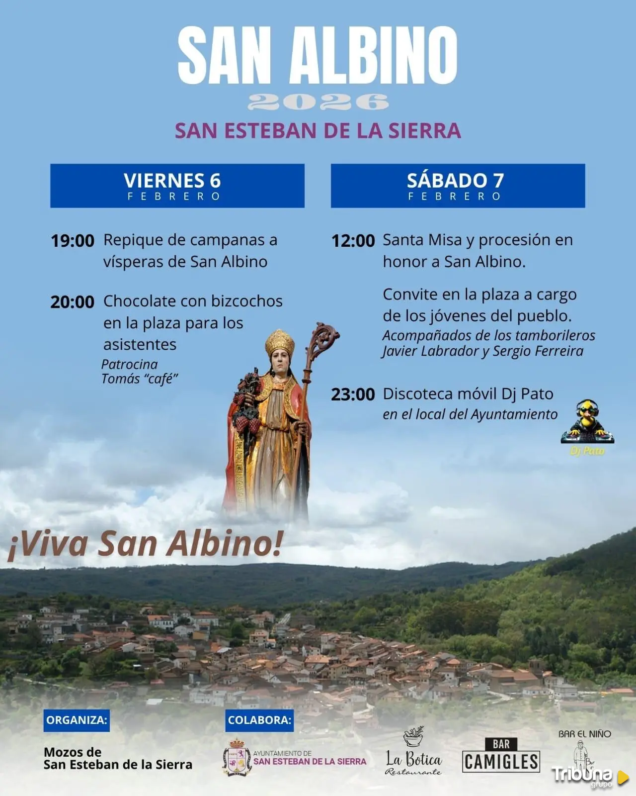 El 7 de febrero las actividades comienzan a las 12:00 horas con la misa y la procesión en honor a San Albino que darán paso al convite en la plaza organizado por los jóvenes del pueblo, que estarán acompañados por los tamborileros Javier Labrador y Sergio Ferreira.