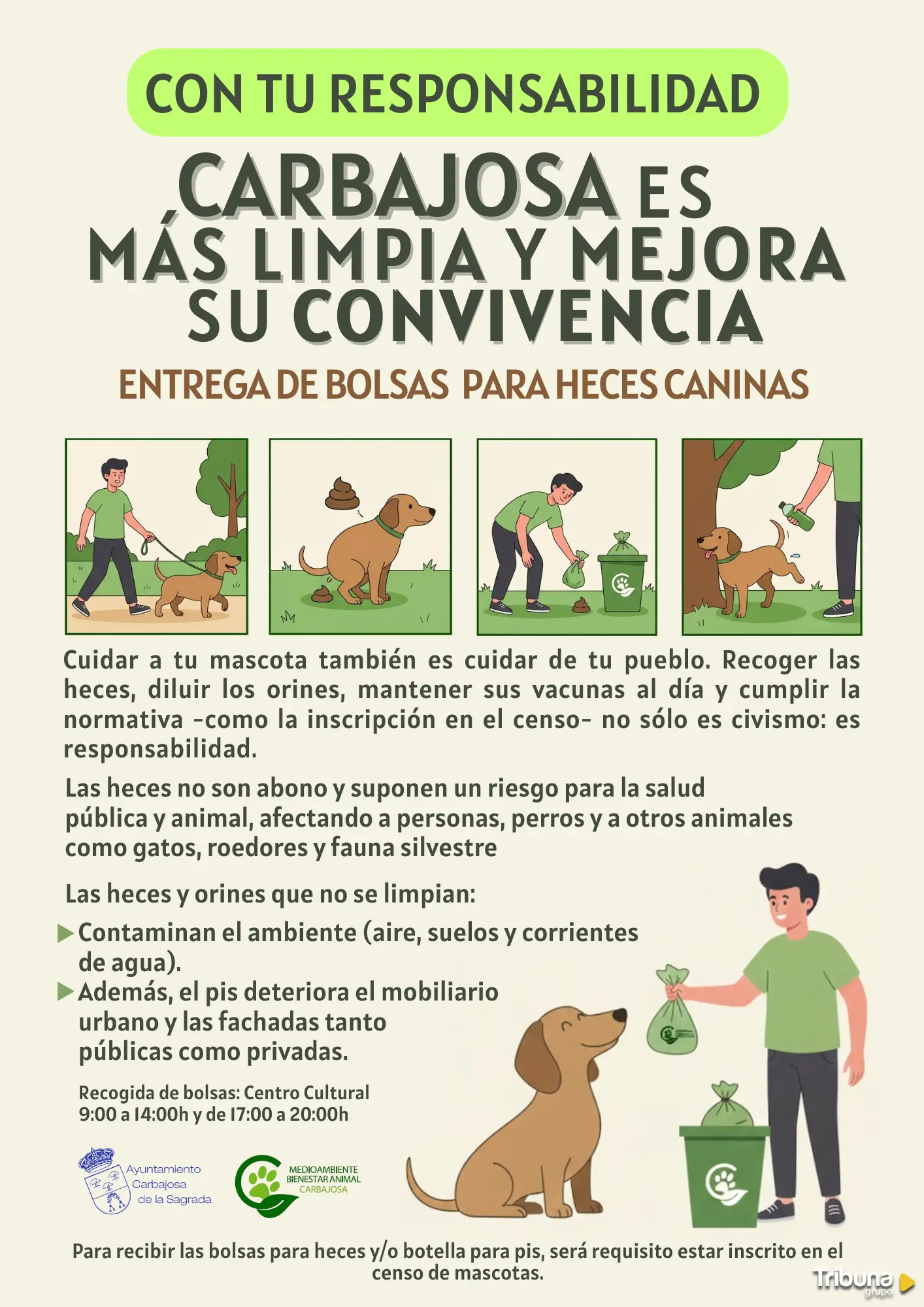 El Ayuntamiento de Carbajosa de la Sagrada ha puesto en marcha una nueva campaña destinada a mejorar la limpieza de los espacios públicos y fomentar una mejor convivencia vecinal mediante la entrega gratuita de dispensadores con bolsas para la recogida de heces caninas y botellas para la limpieza de orines a los vecinos propietarios de perros.
