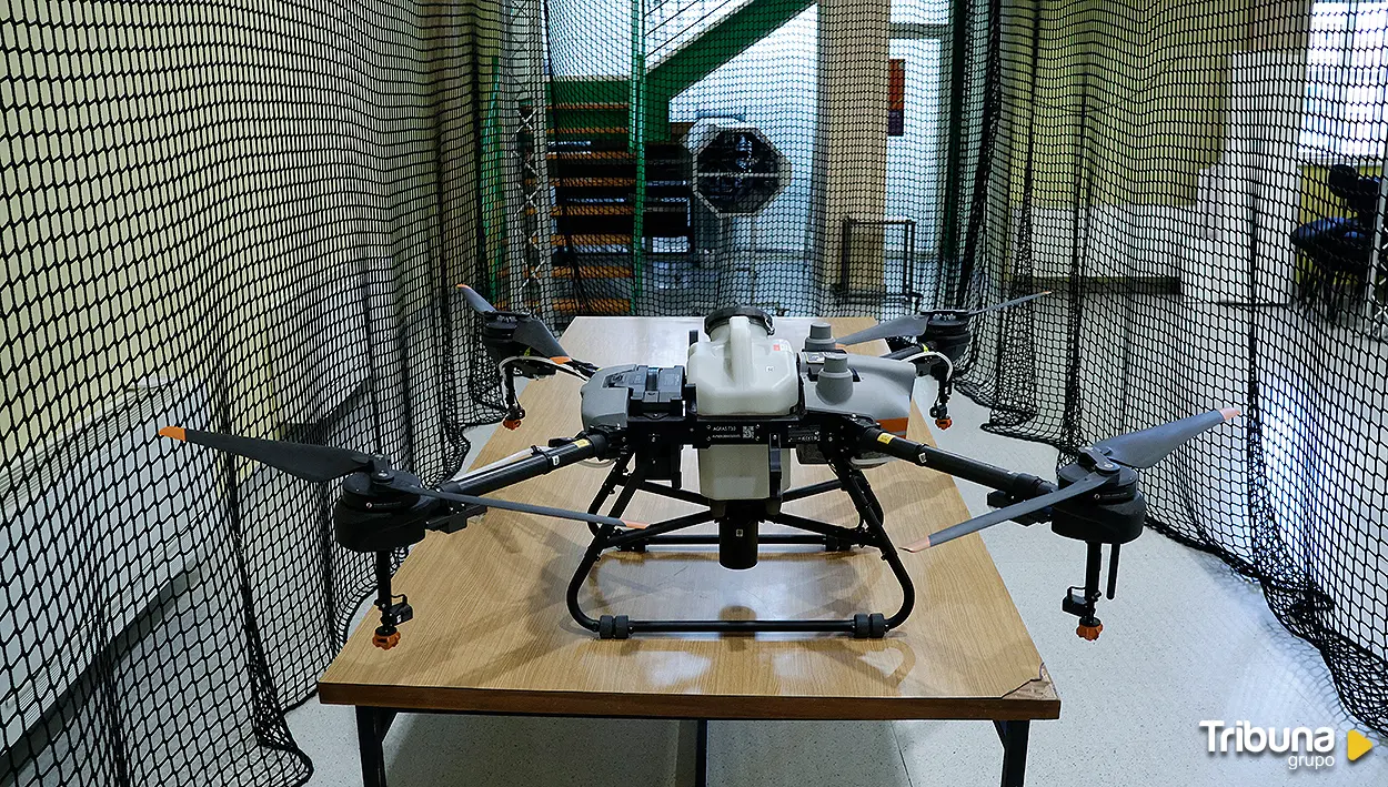 La 'dronoteca' es el 'centro de mando' del curso. Allí montan, desmontan y custodian desde drones que caben en la palma de la mano a 'monstruos' de 25 kilos idénticos a los que se emplean para fumigar campos de cultivo. Tiene dos metros de envergadura con las hélices abiertas, transporta hasta 10 kilos de productos fitosanitarios y emplea un GPS para seguir una ruta y dispersar la carga allí donde sea necesario. Miguel Ángel Casanova destaca que "tenemos mucha relación también con el sector agrícola. Tenemos drones agrícolas y colaboramos con empresas donde les enseñamos también un poco temas de mantenimiento de esos drones".