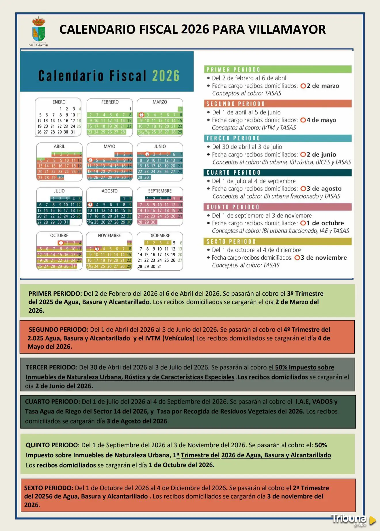 El Ayuntamiento de Villamayor ha publicado oficialmente el Calendario Fiscal correspondiente al año 2026, en el que se recogen los plazos de pago de los principales tributos municipales y tasas por la prestación de servicios básicos.