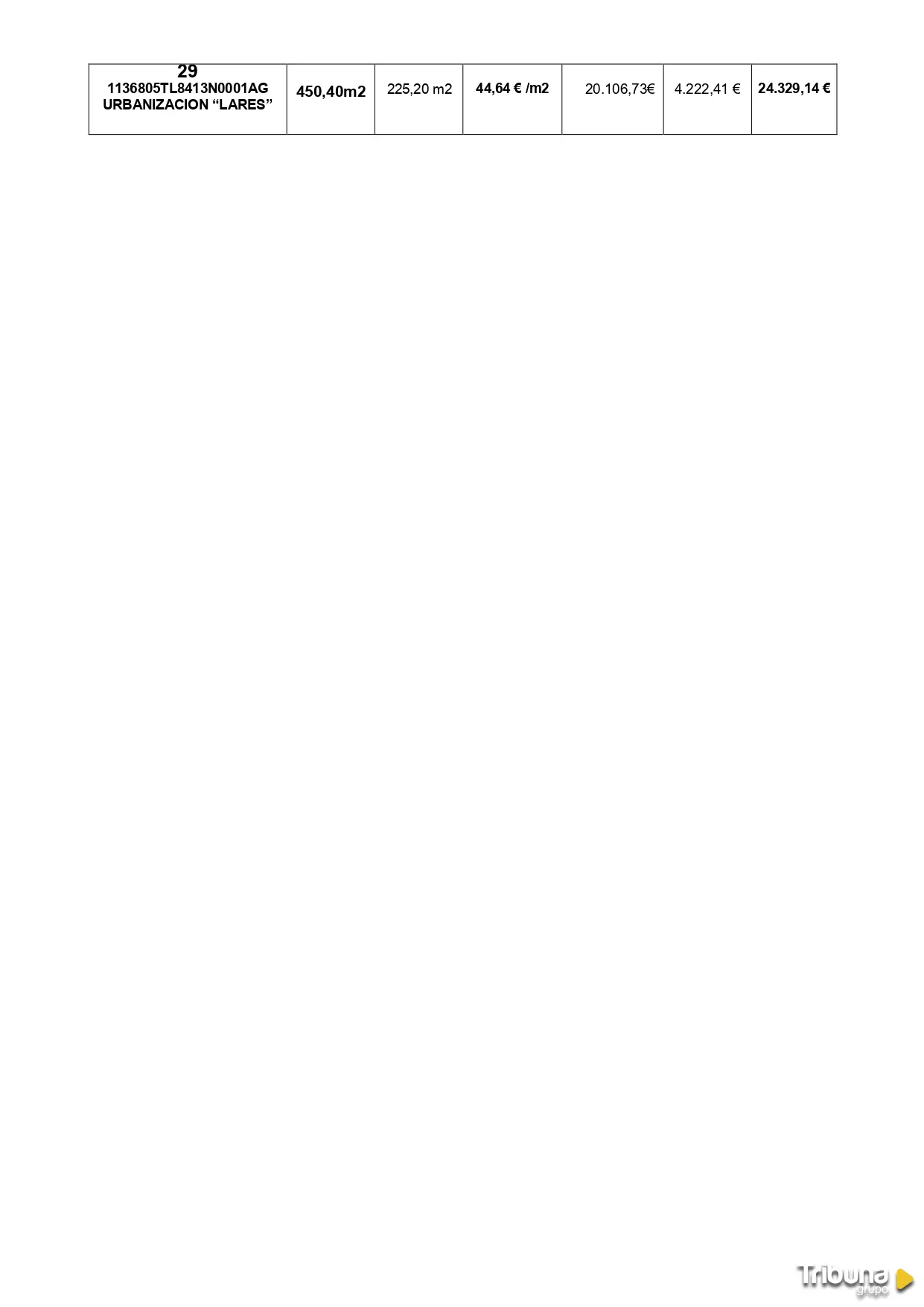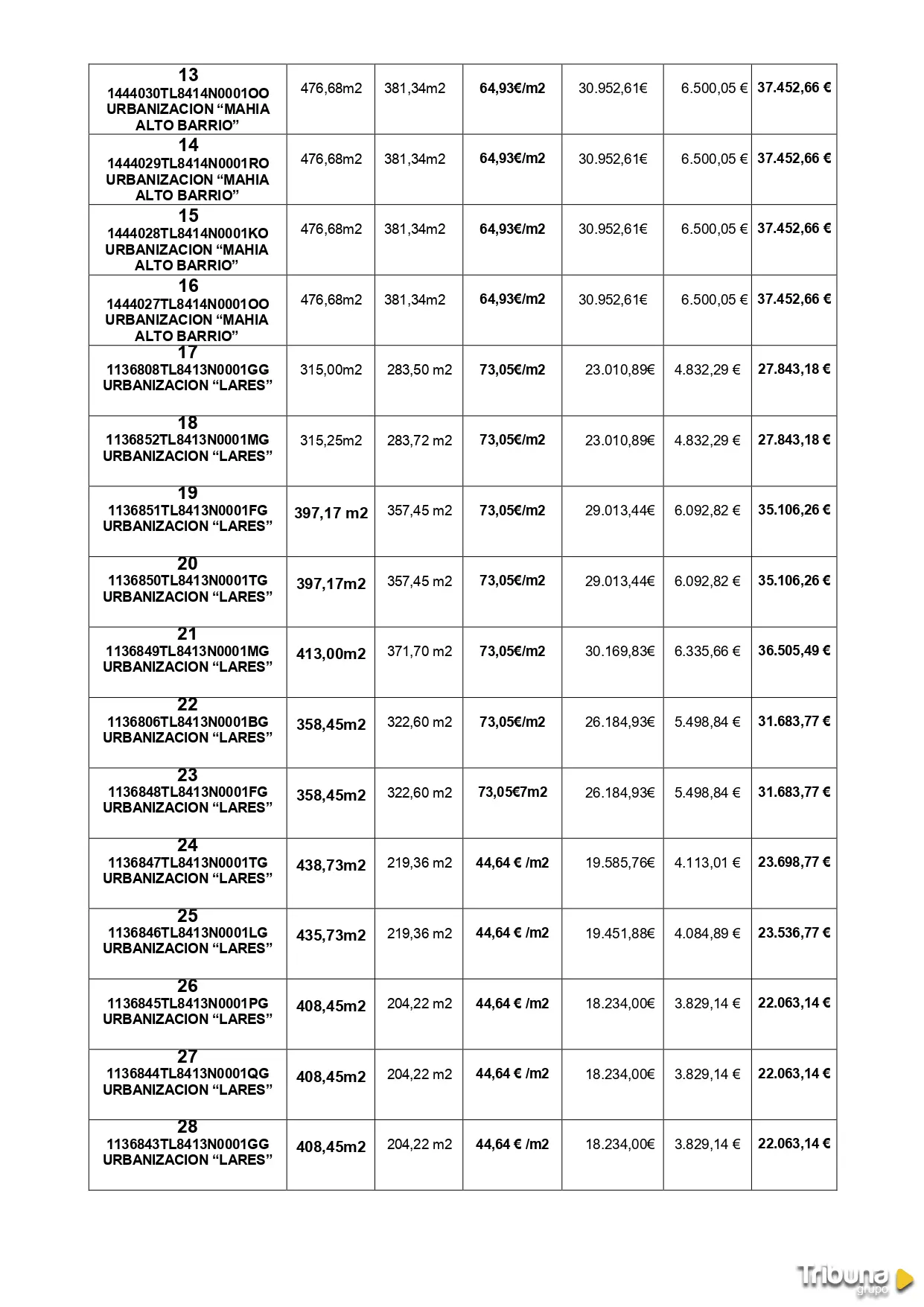 De acuerdo a la citada lista, los terrenos se reparten por las urbanizaciones Lares, Mahía y El Pinar, tienen calificación de suelo residencial y no constan cargas sobre ellos. El precio oscila entre los 48.839 y los 22.063 euros, en función de la localización y la supercifie de las parcelas. Las oferta se presentarán por los precios estimados o al alza, según consta en los pliegos de la subasta.