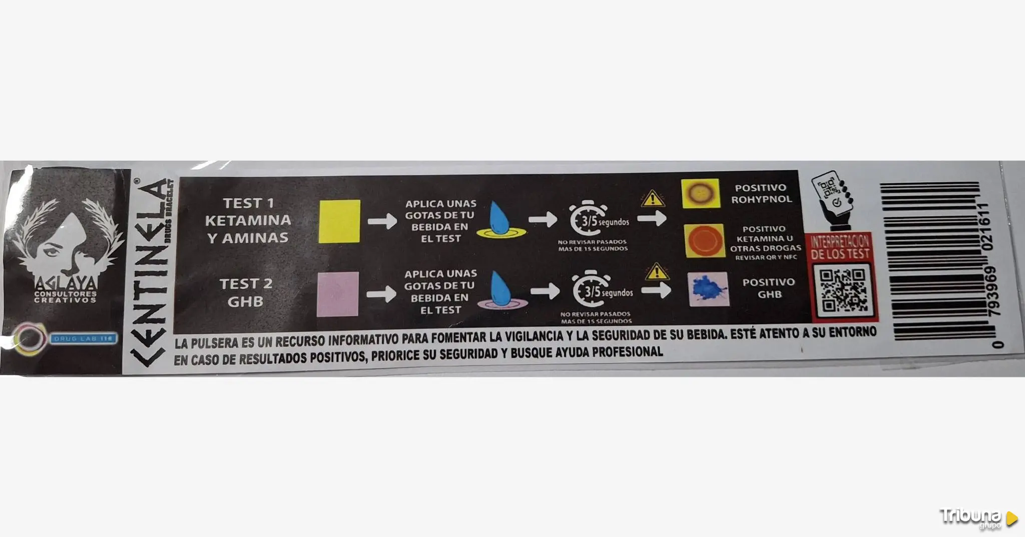 Las pulseras cuentan con un detector de sumisión química. Basta con aplicar unas gotas de la bebida sobre el test incluido en la pulsera y esperar entre 3 y 5 segundos. Si aparece una mancha amarilla, la bebida está contaminada con Rohypnol; si es roja, con ketamina u otras drogas; si es azul, con GHB (extasis líquido). Las pruebas incluyen un código QR que explica cada conclusión.