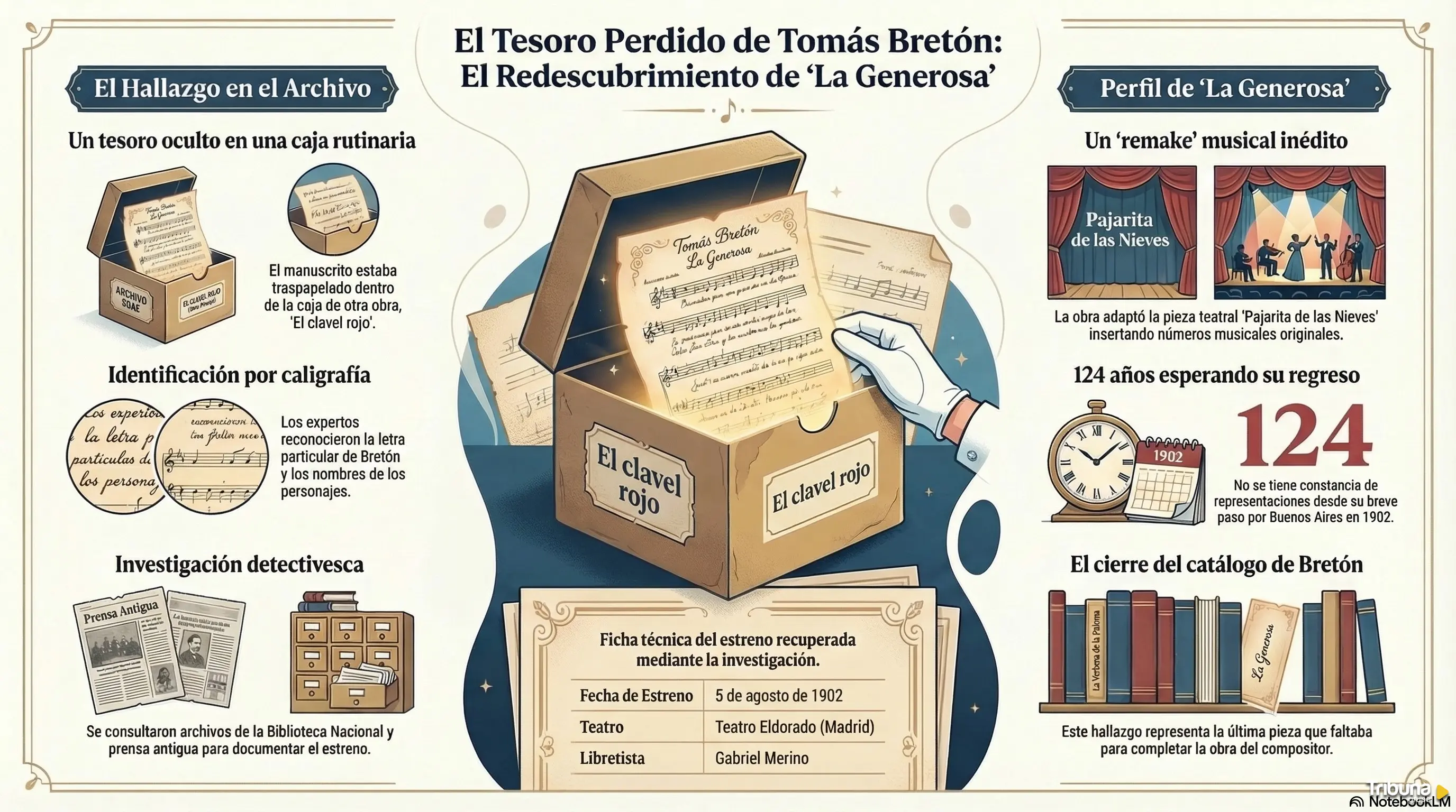 Una consulta en los archivos de la Biblioteca Nacional de España les facilitó la fecha del estreno: 5 de agosto de 1902 en el teatro Eldorado de Madrid. "Esto es importante" porque ni siquiera la biografía de referencia sobre Bretón, "la de mi profesor Víctor Sánchez, publicada por el ICMU hace ya años", recogía información al respecto. Gracias a las reseñas de prensa reconstruyeron el reparto de la primera funcion de 'la Generosa' "con artistas muy importantes del género chico de esa época: Bonifacio Pinedo, Julia Fons, José Ontiveros..."