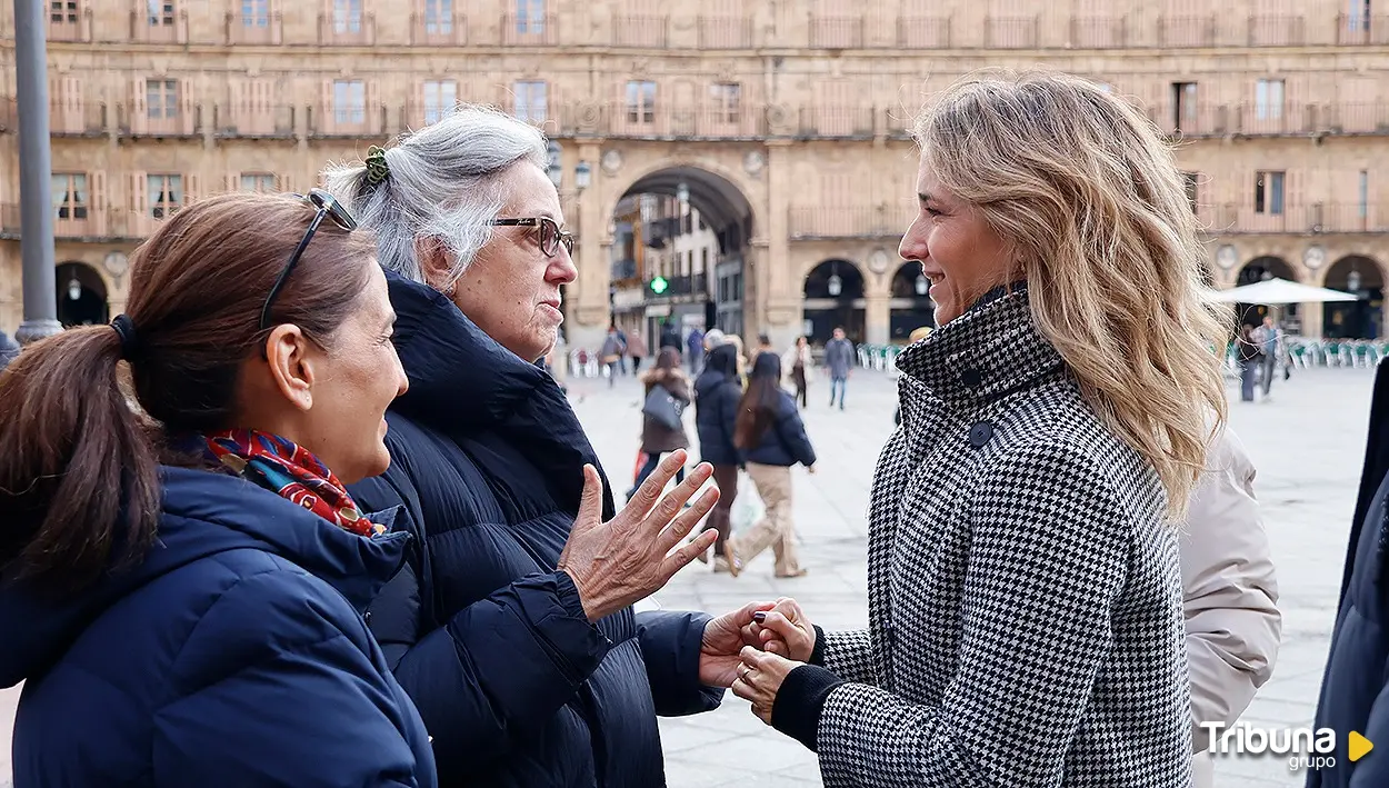 "¡Mira!, ¿es Cayetana?..." "Pues sí, es ella, parece una veinteañera". Y allá que se van las dos mujeres -la que pregunta y la que contesta-, que a esa hora casualmente también pasean por la Plaza Mayor, a saludar a Cayetana Álvarez de Toledo, la diputada y portavoz adjunta del Grupo Parlamentario Popular que este martes ha estado en Salamanca. Y en la plaza también se ha encontrado, y con ella ha conversado un rato, la novillera salmantina Raquel Martín, de paseo con su capote... así, de lo más natural.