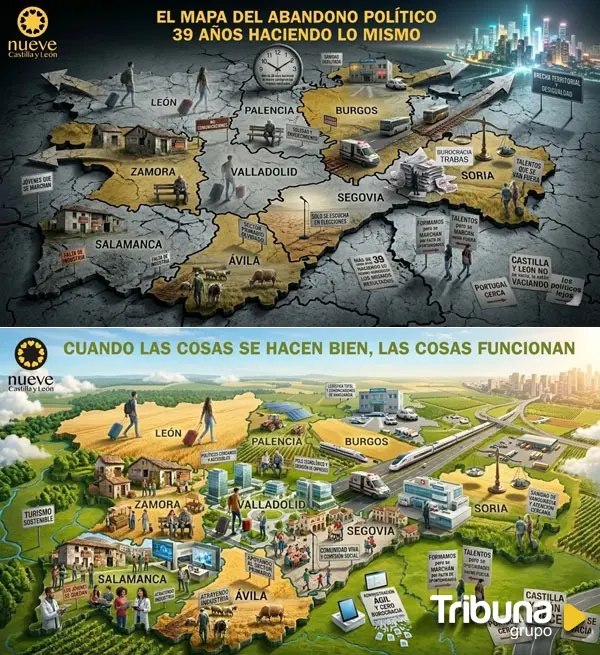 Los mapas de Nueve Castilla y León. Bienvenido sea empezar la jornada con un desayuno y esto es lo que ha hecho Nueve Castilla y León en Salamanca, convocar a la prensa en torno a un café. Y como una imagen vale más que mil palabras, ahí tienen el 'mapa gris' que representaría la despoblación, el envejecimiento y la pérdida de oportunidades económicas y el 'mapa en color' si se aplicaran "políticas centradas en los problemas estructurales".