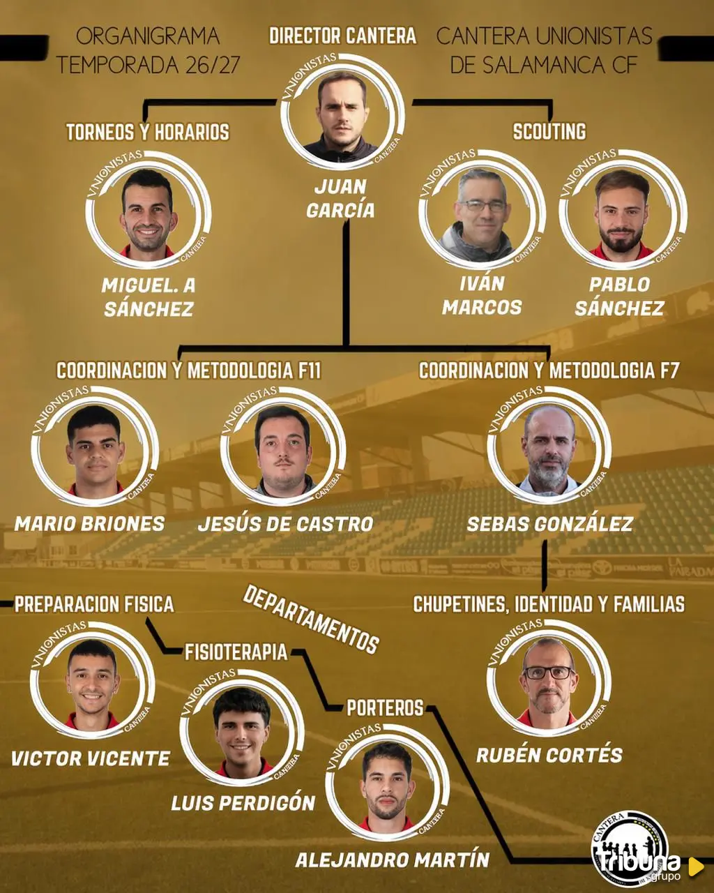 Unionistas de Salamanca sigue trabajando en busca de afianzar el trabajo realizado en la cantera y, a la vez, seguir dando pasos hacia adelante. Por ello, el club charro ha presentado su organigrama para la temporada 2026/2027, un esquema con el que espera poder crecer.